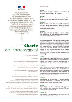 Intégrée à la constitution française le 01-03-2005, la Charte constitutionnelle de l'environnement énonce en dix points droits et devoirs environnementaux du citoyen français et des administrations concernées.