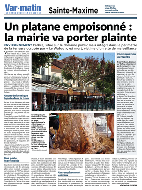 Var-matin s'est fait l'écho, dans son édition du 23 juillet 2010, du dépérissement aussi brutal qu'inquiétant d'un magnifique platane situé sur le domaine public mais à l'intérieur du périmètre occupé par la terrasse du bar-brasserie « Le Wafou ». Presque du jour au lendemain, le feuillage a changé de couleur, laissant présager le pire.