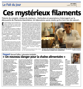 « Je ne dis pas qu’il y a complot. Je dis que ces retombées sont préoccupantes. Mais je n’utilise pas le terme de dangereux car moi-même je ne sais pas d’où cela vient exactement. C’est d’ailleurs tout le problème. Il faut désormais qu’un laboratoire mandaté par l’État analyse ces fibres pour qu’on sache définitivement de quoi il s’agit », conclut le Dr Tailliez, qui croit savoir que le CNRS, à Montpellier, serait sur le coup. En attendant, l’énigme reste entière.