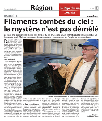 Ce week-end, des filaments blancs sont tombés du ciel en Moselle-Est. Ils ont fait l’objet d’une analyse par un laboratoire privé. Mais les conclusions de cet organisme restent vagues sur l’origine de ces retombées.