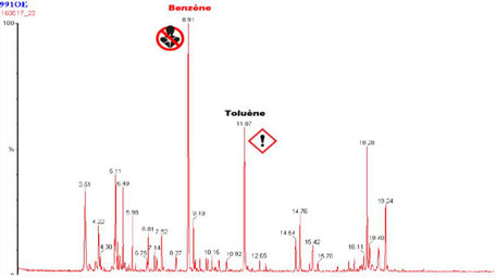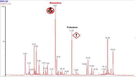 Les contaminants piégés sur ce capteur révèle la présence dans l'air de 20 contaminants volatils différents, dont plusieurs cancérigènes, et parmi lesquels figure le benzène à forte teneur, comme illustré par le chromatogramme ci-contre, extrait du rapport Analytika N°140111 ci-dessous.